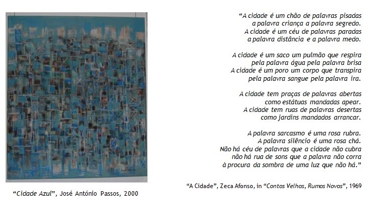 Uma cidade de azul pintada, aqui e além “um céu de palavras paradas”, esperando sorrisos, mãos que se apertam, outras que se desencontram, um misto de cheiros, cores e poemas. E quadros que alguém sempre vai pintando, avisando a nossa memória colectiva, baralhando sons que se misturam, que nos alertam para a vida que vale a pena. O artista, “Cavaleiro”de “Montanhas”, sempre “O Pensador” da cidade das “praças de palavras abertas”, atento a todos os desvios, “à procura da sombra de uma luz que não há” . Porque se desprende dos ambientes do fausto, volta às origens “...já o meu pai pintava”, conhece novas realidades que transmite á sua obra, um “Encontro” com as suaves presenças de uma Angola recente que marca as pessoas, porque as pessoas marcam mesmo quando são distantes, a distância que importa? Ao "Ego declara Morte", alguma coisa tem que se apagar, renascendo porém a cada momento na dialéctica permanente da cidade, passa as palavras para a tela, reinventa poemas em aguarela e acrílico, “… não há céu de palavras que a cidade não cubra”.